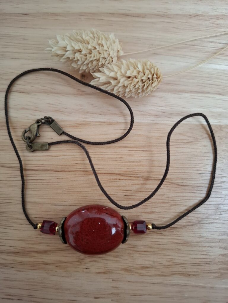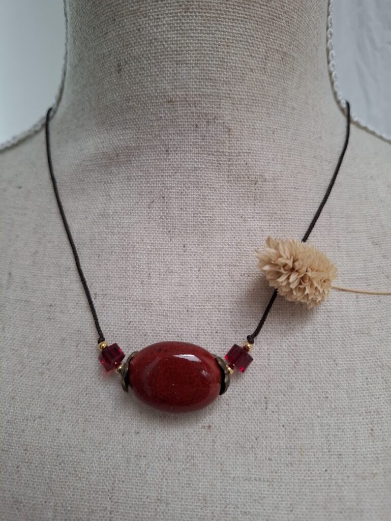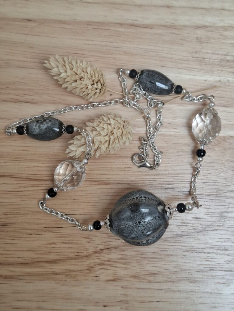 • des créations mettant en valeur la céramique, associée à des éléments métalliques et à des perles de type Swarovski, le plus souvent montées sur cordon.